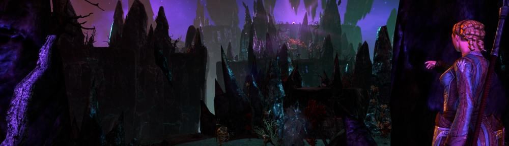 I follow Sara Benele into the Mage’s Staff obelisk and we discover a realm within that is drenched in magicka. It feels like we are caught inside an iridescent gemstone, coruscating with colours no mortal has ever seen. The air about fizzles and sparks, feeling at times as if the next spell cast might ignite the whole realm. Whilst looking up to the sky is not unlike looking into the oily puddles of a dwemer ruin; this is an altogether ghastly beautiful place.