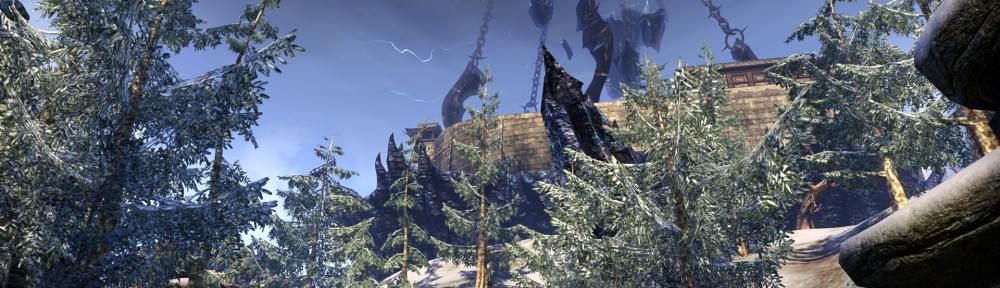 The Cloud Ruler Temple, located high in the Jerall Mountains northwest of Bruma, is more fortress then sanctuary. It was said to have been built at the very founding of the Second Empire by Reman Cyrodiil’s Akaviri Dragonguard. The temple is now all but inaccessible as at the height of the Planemeld a Dark Anchor was opened above it and the entire temple was lifted from the ground in an attempt to drag it into Coldharbour. Before the daedra were able to fully abduct it however the Planemeld threat was ended. Yet the Dark Anchor has somehow persisted above the temple beyond the destruction of the Planar Vortex, whilst dremoran warriors and daedric harvesters continue to guard the approach and surrounding area.